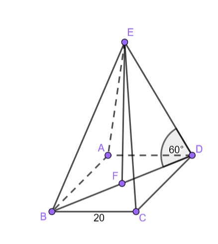 Mając dany kwadrat o boku 20 cm oraz wiedząc, że jest on podstawą ostrosłupa prostego i krawędź boczna ostrosłupa tworzy kąt 60° z tym kwadratem, określ, ile ma wysokość tej bryły.