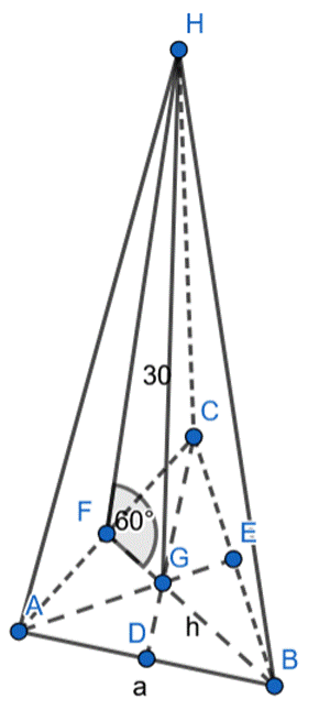 Wyznacz wysokość ściany bocznej poprowadzonej z wierzchołka ostrosłupa, jeśli wysokość ostrosłupa prawidłowego trójkątnego jest równa 30 cm, a kąt dwuścienny przy jego podstawie jest równy 60°.
