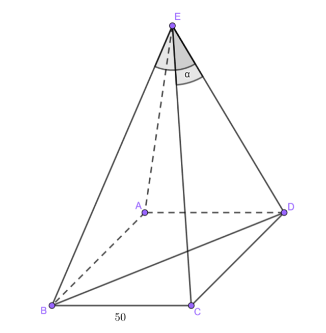 Mając dany kwadrat o boku 50 cm oraz wiedząc, że jest on podstawą ostrosłupa prostego i krawędzie przeciwne krawędzie boczne tworzą kąt prosty, określ, miarę kąta pomiędzy krawędziami bocznymi, które są obok siebie.