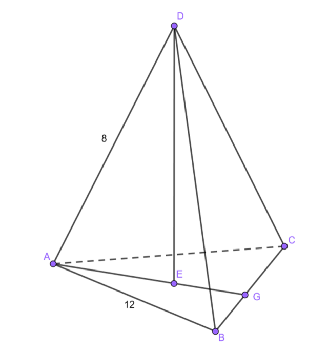 Wiedząc, że ostrosłup prosty, którego podstawą jest trójkąt równoboczny o boku długości 12 dm, ma krawędź boczną o długości 8 dm. określ, ile ma wysokość tej bryły.