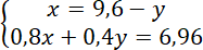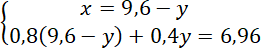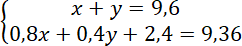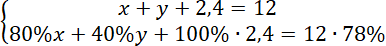Drugie równanie układu powstało ze zdania: kawałek stopu o zawartości 80% czystego złota i kawałek stopu o zawartości 40% czystego złota stopiono z stopiono z 2,4 g czystego złota i otrzymano 12 g stopu o zawartości 78% złota.