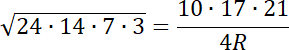 Zauważ, że skoro wszystkie krawędzie boczne mają jednakową długość, to spodek wysokości ostrosłupa jest środkiem okręgu opisanego na podstawie. Skorzystaj ze wzoru na pole trójkąta z promieniem okręgu opisanego oraz połową obwodu i z powstałego równania wyznacz długość R. Na koniec skorzystaj z twierdzenia Pitagorasa w trójkącie GCH i wyznacz długość krawędzi bocznej ostrosłupa.