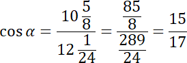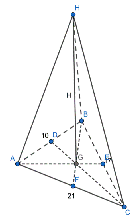 Wyznacz cosinus kąta nachylenia krawędzi bocznej do płaszczyzny podstawy, jeśli podstawą ostrosłupa prostego jest trójkąt, którego boki mają długość 21 cm, 17 cm i 10 cm, a wysokość ostrosłupa jest równa