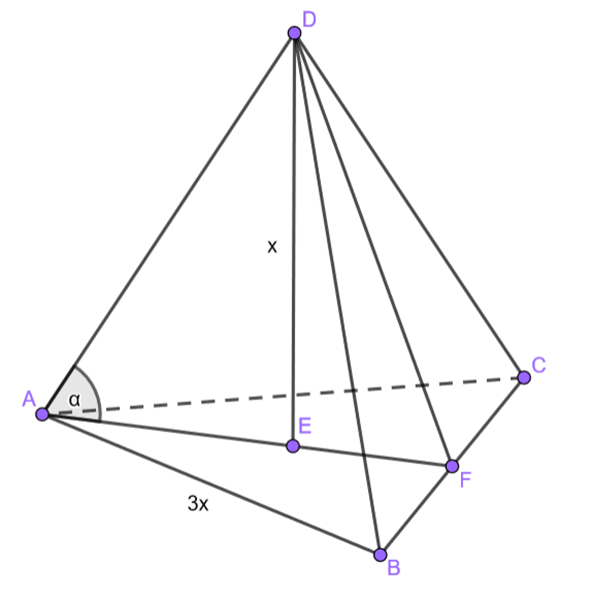 Stwórz rysunek pomocniczy, gdzie x to wysokość ostrosłupa, a α to poszukiwany kąt:
