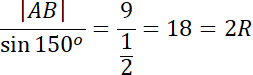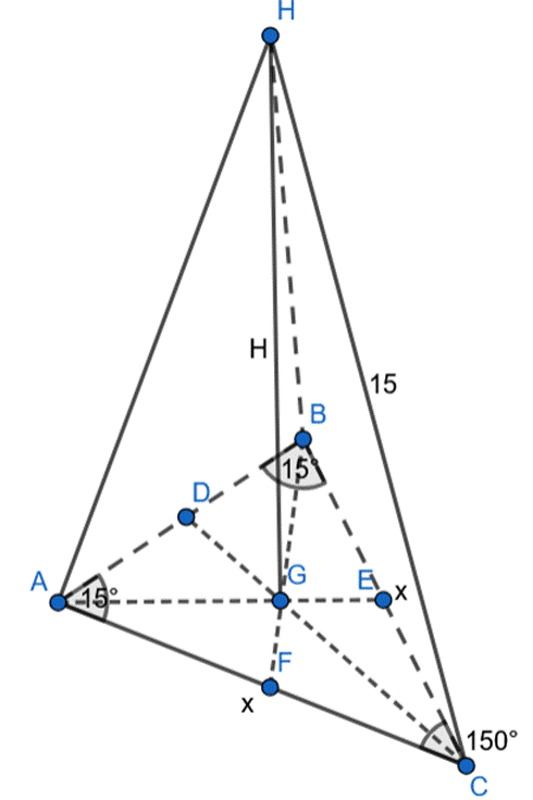 Oblicz wysokość tego ostrosłupa, jeśli podstawą ostrosłupa prostego jest trójkąt równoramienny, którego jeden z kątów jest równy 150°, a dwa jego boki mają długość