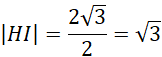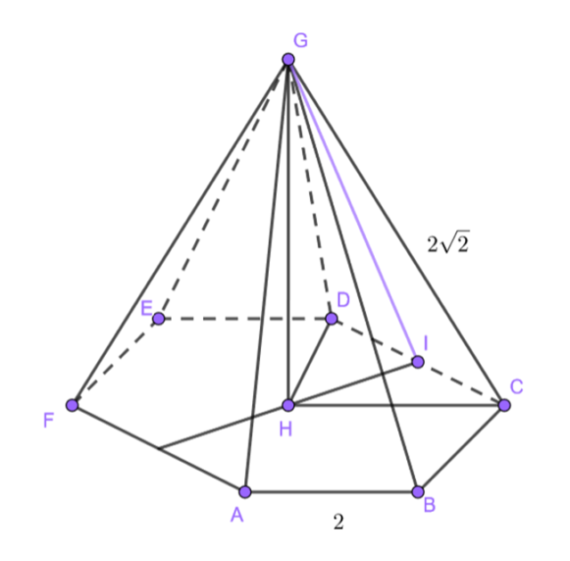 Zwróć uwagę na to, że punkt H jest miejscem przecięcia się dłuższych przekątnych sześciokąta. Dodatkowo pamiętaj, że sześciokąt foremny składa się z 6 trójkątów równobocznych, które mają wspólny wierzchołek w H i ich boki zawierają się w dłuższych przekątnych, dlatego też odcinek HI jest wysokością tego trójkąta i można go obliczyć ze wzoru