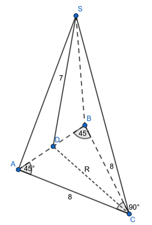 Wyznacz sinus kąta nachylenia krawędzi AS do płaszczyzny podstawy ostrosłupa ABCS, jeśli jego podstawą jest trójkąt prostokątny równoramienny ABC, spodek wysokości jest środkiem przeciwprostokątnej AB, ostrosłup ma wysokość 7 cm, a krawędź AC ma długość 8 cm