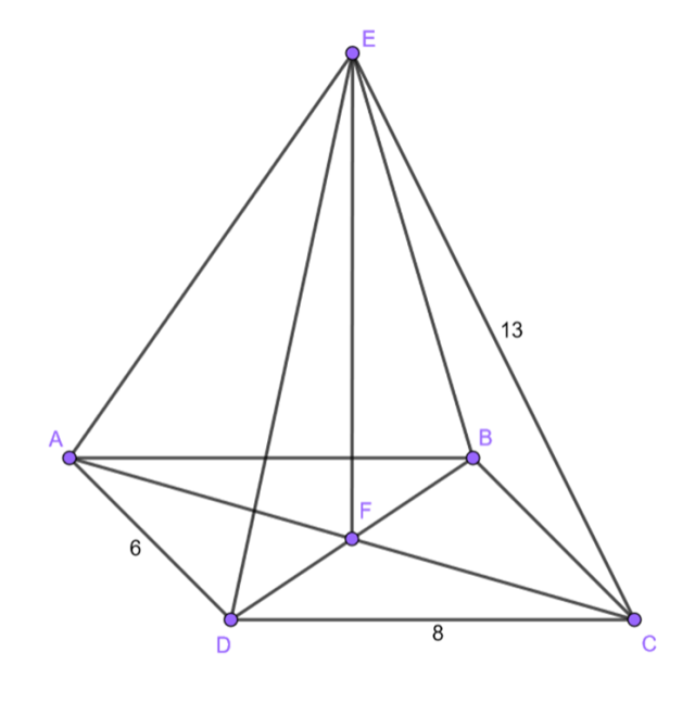 Pamiętaj, że przekątne w prostokącie przecinają się w połowie. Oblicz długość przekątnej AC, wykorzystując twierdzenie Pitagorasa. Zauważ, że odcinek FC jest równy połowie długości przekątnej i dzięki niemu jesteś w stanie obliczyć długość wysokości. Wystarczy, że użyjesz twierdzenia Pitagorasa w trójkącie CEF.