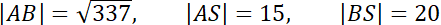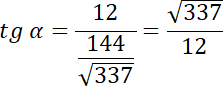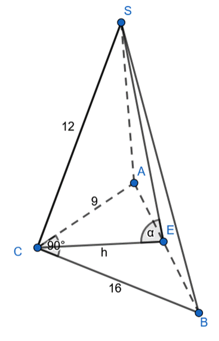 Wyznacz tangens kąta nachylenia płaszczyzny (ABS) do płaszczyzny podstawy tego ostrosłupa, jeśli podstawą ostrosłupa ABCS jest trójkąt prostokątny ABC, w którym przyprostokątne mają długość: |AC| = 9, |BC| = 16, spodkiem wysokości ostrosłupa jest wierzchołek C, a wysokość ostrosłupa jest równa 12.
