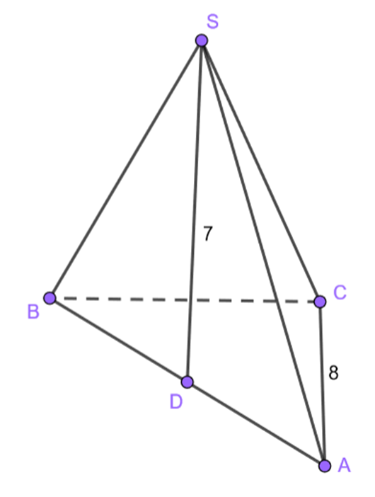 Mając dany trójkąt prostokątny równoramienny ABC, którego przyprostokątna ma długość 8 cm oraz wiedząc, że jest on podstawą ostrosłupa ABCS, którego wysokość wynosi 7 cm, a spodek wysokości dzieli przeciwprostokątną trójkąta ABC na pół, określ, ile razem mają krawędzie boczne tej bryły.