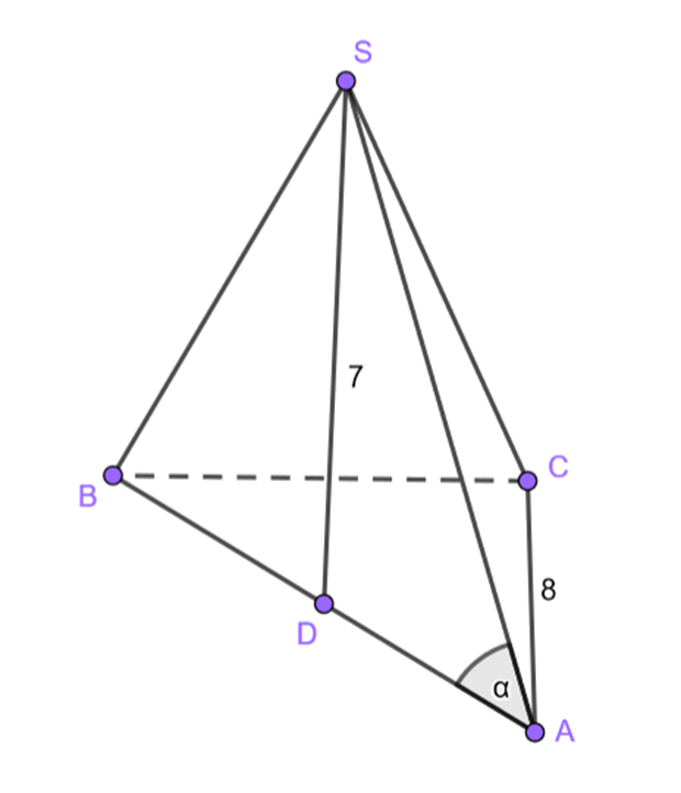 Mając dany trójkąt prostokątny równoramienny ABC, którego przyprostokątna ma długość 8 cm oraz wiedząc, że jest on podstawą ostrosłupa ABCS, którego wysokość wynosi 7 cm, a spodek wysokości dzieli przeciwprostokątną trójkąta ABC na pół, wyznacz, sinus kąta zawartego pomiędzy odcinkiem AS, a podstawą bryły.