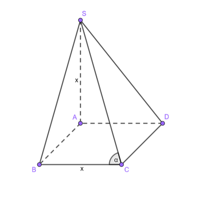 Stwórz rysunek pomocniczy, gdzie x to długość krawędzi podstawy, a kąt α to poszukiwany kąt: