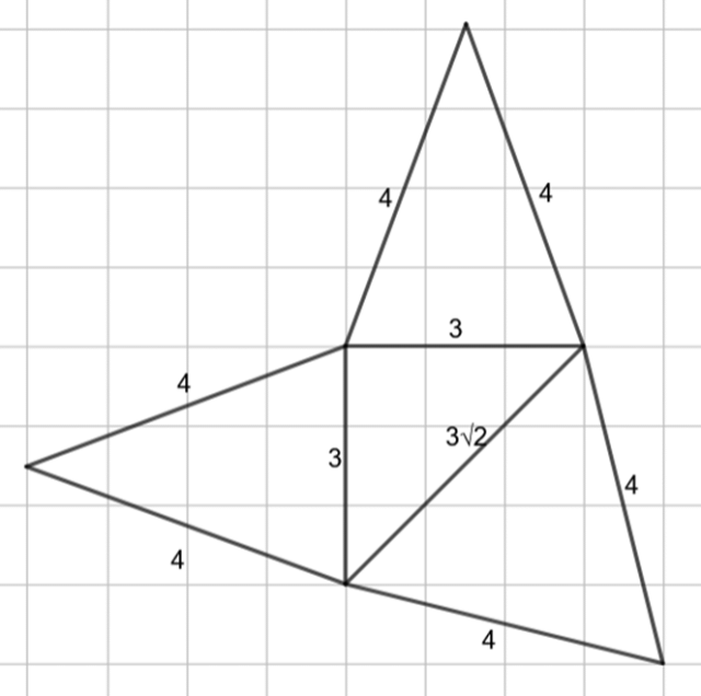 Wykonaj siatkę ostrosłupa, którego podstawą jest trójkąt równoramienny, a spodek wysokości jest środkiem przeciwprostokątnej tego trójkąta.