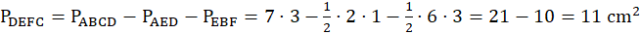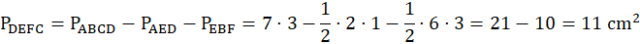 Należy obliczyć pole czworokąta DEFC wiedząc, że boki prostokąta ABCD mają długość |AB| = 7 cm, |BC| = 3 cm, punkty E, F leżą kolejno na bokach AB, BC w taki sposób, że |DE| = 3|EF| oraz