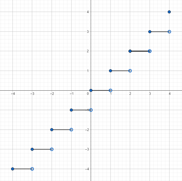 Narysuj wykres funkcji przyporządkowującej każdej liczbie rzeczywistej x z przedziału <-4; 4> największą liczbę całkowitą y mniejszą bądź równą x.