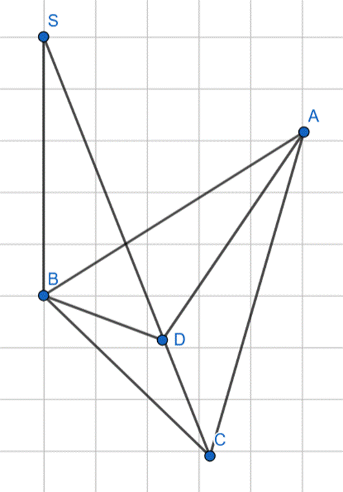 Odcinek AB jest prostopadły do odcinków BS i BC, więc jest prostopadła do płaszczyzny BSC. Czyli każda prosty odcinek znajdujący się w płaszczyźnie BSC jest prostopadły do odcinka AB. Oznacza to, że odcinek DB, który znajduję się w płaszczyźnie BSC jest także prostopadły do odcinka AB, więc kąt ABD jest prosty, a trójkąt ABD prostokątny.