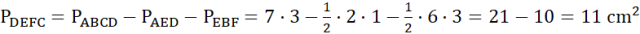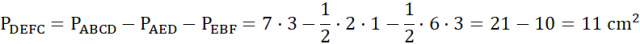 Należy obliczyć pole czworokąta DEFC wiedząc, że boki prostokąta ABCD mają długość |AB| = 7 cm, |BC| = 3 cm, punkty E, F leżą kolejno na bokach AB, BC w taki sposób, że |DE| = 3|EF| oraz