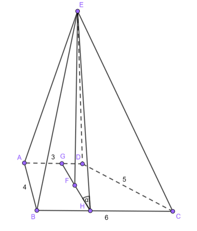 Zauważ, że w ostrosłupie wszystkie ściany boczne tworzą taki sam kąt z płaszczyzną podstawy, wtedy i tylko wtedy, gdy w tą podstawę można wpisać okrąg. Pamiętaj, że promienie okręgu wpisanego w czworokąt padają pod kątem prostym do boków tego czworokąta, oznacza to, że ramię prostopadłe do obydwu podstaw ma długość dwóch promieni. Dzięki temu wyliczysz długość promienia. Następnie wykorzystaj twierdzenie Pitagorasa w trójkącie EFH i oblicz długość odcinka EH. Na koniec skorzystaj z definicji funkcji trygonometrycznych kąta ostrego w trójkącie prostokątnym i oblicz wartość sin α.