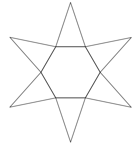 Pamiętaj, że długości krawędzi ścian bocznych pokrywających się z krawędzią podstawy muszą być takiej samej długości. Podstawa jest sześciokątem foremnym. Siatka ostrosłupa prawidłowego sześciokątnego ma sześć identycznych trójkątów równoramiennych, które są ścianami tej bryły.