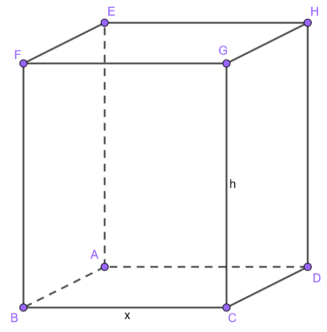 Stwórz rysunek pomocniczy, gdzie x to długość krawędzi podstawy, a h to wysokość: