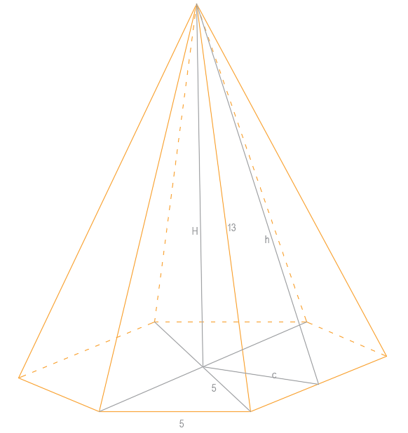 Dany jest ostrosłup o ścianie bocznej w postaci trójkąta o równoramiennego o ramieniu 13 i podstawie 5, znajdź jego wysokość,