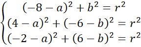 Pod wzór na równanie okręgu podstaw współrzędne podanego trójkąta i z powstałego układu równań wyznacz jego środek. Następnie skorzystaj ze wzoru na środek ciężkości trójkąta o wierzchołkach ABC: