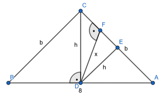 Wyznacz długość ramienia oraz pole tego trójkąta, jeśli podstawa AB trójkąta równoramiennego ABC ma długość 8 cm, a wysokość CD równa jest długość odcinka DE łączącego środek podstawy ze środkiem ramienia.