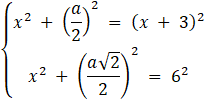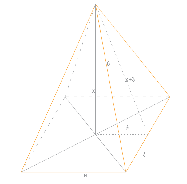 Dany jest ostrosłup prawidłowy czworokątny o krawędzi bocznej długości 6 i wysokości o 3 krótszej od wysokości ściany bocznej. Znajdź jego wysokość.