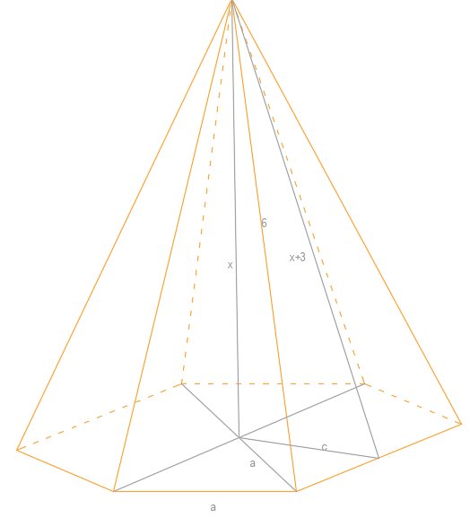 Dany jest ostrosłup prawidłowy sześciokątny o krawędzi bocznej długości 6 i wysokości o 3 krótszej od wysokości ściany bocznej. Znajdź jego wysokość.