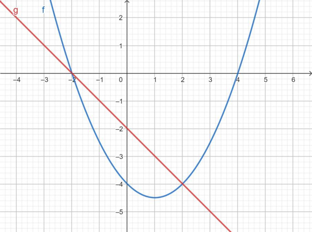 Rozwiązaniem równania f(x) = g(x) są miejsca przecięcia obydwu funkcji, czyli x = - 2 i x = 2.