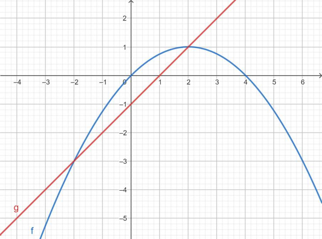 Rozwiązaniem równania f(x) = g(x) są miejsca przecięcia obydwu funkcji, czyli x = - 2 i x = 2.