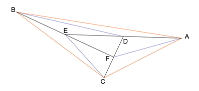 Wyznacz pole trójkąta ABC, wiedząc, że pole trójkąta DEF wynosi P a punkty D, E, F to środki odpowiednio odcinków AE, BF i CD.