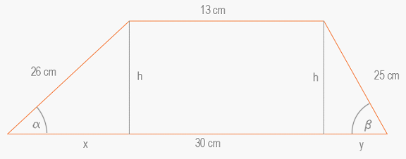 Dany jest trapez o podstawach 13 cm i 30 cm i ramionach 25 cm, 26 cm. Oblicz, jaką miarę mają kąty, pod jakimi ramiona przecinają dłuższą podstawę.