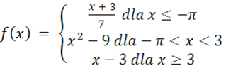 Sprawdzamy miejsca zerowe każdej z własności funkcji i sprawdzamy je z dziedziną. Aby znaleźć miejsca zerowe funkcji należy porównać jej wzór do zera. W tym wypadku przyrównujemy trzy wzory składowe funkcji f do zera, aby dowiedzieć się ile miejsc zerowych ma ta funkcja.