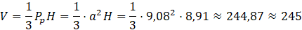 Z zależności trygonometrycznych oblicz wysokość ostrosłupa (H) oraz długość krawędzi podstawy (a). Następnie oblicz objętość (V) i pole całkowite (P) tej bryły.