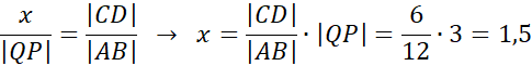 Możemy zauważyć, że trójkąty ABC i QPC są do siebie podobne z cechy kąt – kąt – kąt. Zapisując równanie wynikające z tego podobieństwa: