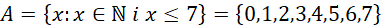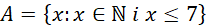 Elementy zbioru A to takie, liczby, które należą do zbioru liczb naturalnych i są mniejsze bądź równe 7. Wyznacz wszystkie takie liczby.