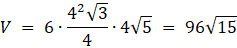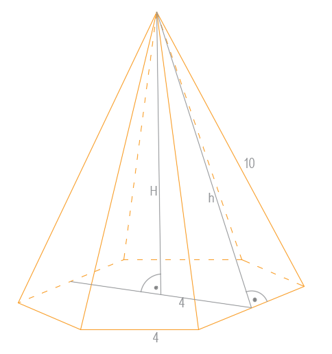 Dany jest ostrosłup prawidłowy sześciokątny o krawędzi bocznej równej 10 i krawędzi podstawy równej 4. Oblicz jego objętość i pole powierzchni.
