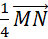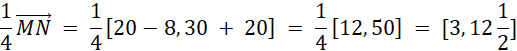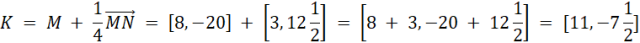 Punkt K dzieli odcinek MN w stosunku 1:3, to znaczy, że dzieli go na 4 równe części. Współrzędne punkty K możemy obliczyć przesuwając punkt M o wektor