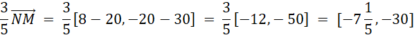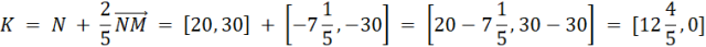 Punkt K dzieli odcinek MN w stosunku 3:2, to znaczy, że dzieli go na 5 równych części. Współrzędne punkty K możemy obliczyć przesuwając punkt N o wektor