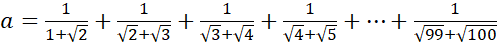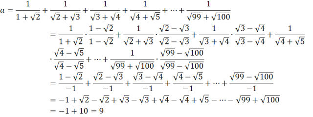 Zauważ, że aby usunąć niewymierność z mianownika podanego ułamka, musisz pomnożyć jego licznik i mianownik, przez wartość mianownika z przeciwnym znakiem pomiędzy liczbami. Postąp tak dla każdej z liczb w każdym z podanych wyrażeń i przedstaw je w najprostszej postaci. Na koniec oblicz sumę uzyskanych wyników.