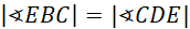 Kąty DAE i BAC są wierzchołkowe. Kąty CDE i EBC są równe, ponieważ są oparte na jednym łuku. Skoro dwa kąty w trójkącie są identyczne, to z sumy kątów w trójkącie trzeci też będzie identyczny, czyli te dwa trójkąty będą do siebie podobne na podstawie cechy kkk.