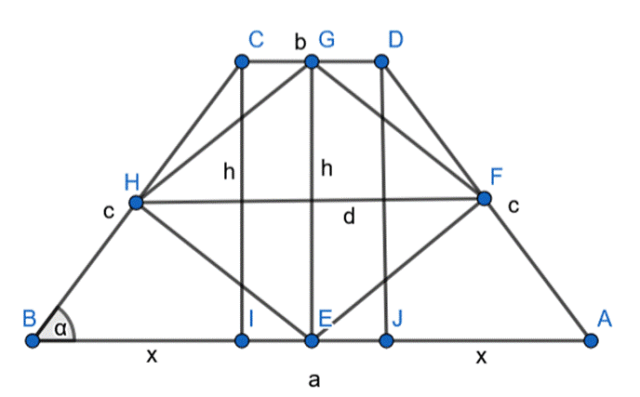 Skorzystaj z tego, że odcinek łączący środki ramion trapezu jest równy średniej arytmetycznej długości jego podstaw oraz z funkcji tangens, aby wyznaczyć długości przekątnych powstałego czworokąta i obliczyć jego pole.