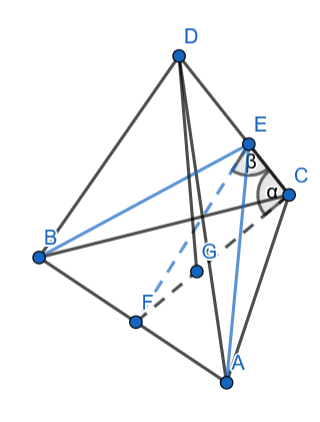 Oblicz pole S przekroju czworościanu płaszczyzną poprowadzoną przez wybraną krawędź i przecinającą przeciwległą krawędź pod danym kątem , jeśli dany jest czworościan foremny o krawędzi długości .
