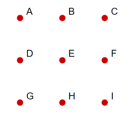 Zacznij od prostokątów, których jednym z wierzchołków jest punkt A. Warto zauważyć, że znając dwa przeciwległe wierzchołki prostokąta, możesz określić dwa pozostałe. Wiedząc na przykład, że dwa przeciwległe wierzchołki pewnego prostokąta to A i F, możesz stwierdzić, że pozostałymi dwoma muszą być C i D. C, ponieważ leży w tej samej kolumnie co F i w tym samym rzędzie co A i D, ponieważ leży w tej samej kolumnie co A i w tym samym rzędzie co F. Ułatwia to nasze zadanie, ponieważ nie szukasz już zbiorów czterech punktów, a zbiorów dwóch punktów. Nie z każdej pary punktów da się jednak utworzyć prostokąt. Spróbuj na przykład utworzyć prostokąt, którego przeciwległymi wierzchołkami są punkty A i B. Nie jest to możliwe, ponieważ nie ma takiego punktu, który leży w tej samej kolumnie co B i w tym samym rzędzie co A, ani takiego, który leży w tej samej kolumnie co A i w tym samym rzędzie co B, więc nie możesz określić dwóch pozostałych wierzchołków tego prostokąta. Taki sam problem napotkasz, jeśli spróbujesz utworzyć prostokąt, którego przeciwległymi wierzchołkami są punkty leżące w tej samej kolumnie, np. A i D. Wniosek z tego jest taki, że dwa punkty muszą leżeć w innych kolumnach i w innych rzędach, aby mogły być przeciwległymi wierzchołkami prostokąta. Punkty, które mogą z punktem A utworzyć przeciwległe wierzchołki prostokąta to E, F, H, I, czyli jest ich 4. Każdy z punktów ma 4 takie punkty, które leżą w innych rzędach i kolumnach niż one same. Jest 9 punktów, każdy z nich może utworzyć parę z 4 innymi, więc można utworzyć 36 par punktów tworzących przeciwległe wierzchołki prostokąta. Sposób, którym policzyłeś możliwe pary punktów, uwzględnił każdą parę dwa razy. Możliwe pary dla punktu A to E, F, H, I, a możliwe pary dla punktu I to A, B, D, E, czyli para punktów A oraz I została policzona dwa razy. Rzeczywista ilość różnych par punktów będzie więc równa 36 : 2, czyli 18. Trzeba jednak zauważyć, że każdy prostokąt ma 4 wierzchołki, i dwie pary wierzchołków przeciwległych. Prostokąt ADFC ma przeciwległe wierzchołki A i F oraz C i D. każdy prostokąt można więc utworzyć z dwóch różnych par punktów, czyli ilość prostokątów będzie dwa razy mniejsza od ilości par punktów. Ilość możliwych prostokątów będzie więc równa 18 : 2, czyli 9.