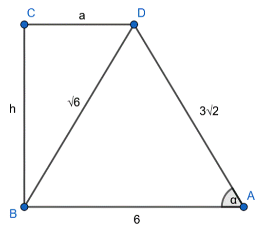 Wyznacz i obwód trapezu prostokątnego, którego dłuższa podstawa ma długość 6, ramię ma długość i tworzy z podstawą kąt , a którsza przekątna ma długość