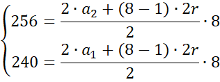 Wyznacz pierwszy i ostatni wyraz tego ciąg, jeśli ciąg arytmetyczny składa się z szesnastu wyrazów. Suma wyrazów o numerach parzystych jest równa 256, a suma wyrazów o numerach nieparzystych jest równa 240. Oblicz pierwszy i ostatni wyraz tego ciągu.