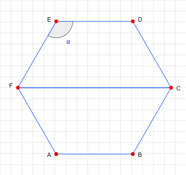 Podziel sześciokąt na dwa trapezy równoramienne, jak na rysunku. Suma miar kątów położonych przy jednym ramieniu trapezu jest równa