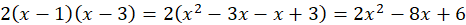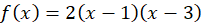 Miejscami zerowymi funkcji będą punkty (1, 0) i (3, 0). Współrzędna p wierzchołka wynosi 2. Zapisz funkcję w postaci iloczynowej. Kolejno zapisz wzór tej funkcji w postaci ogólnej i na koniec wyznacz p i q ze wzorów