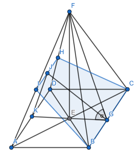 Oblicz pole otrzymanego przekroju, jeśli w ostrosłupie prawidłowym czworokątnym przez krawędź podstawy o długości poprowadzono płaszczyznę, która dzieli kąt dwuścienny między ścianą boczną a płaszczyzną podstawy ostrosłupa na połowy.